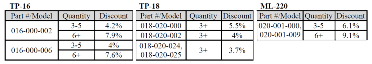 No other volume discounts apply to any other models, options, equipment, or installation